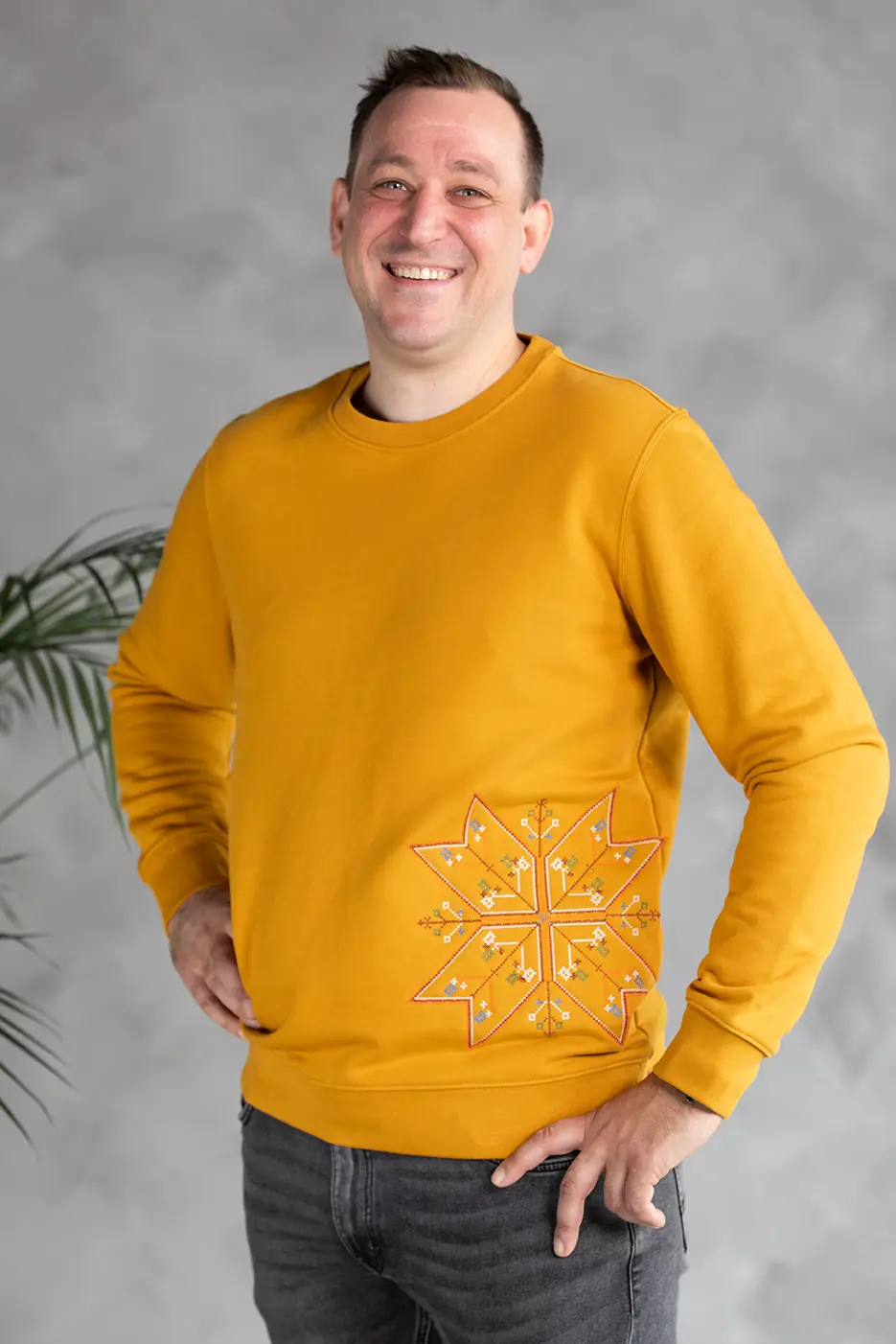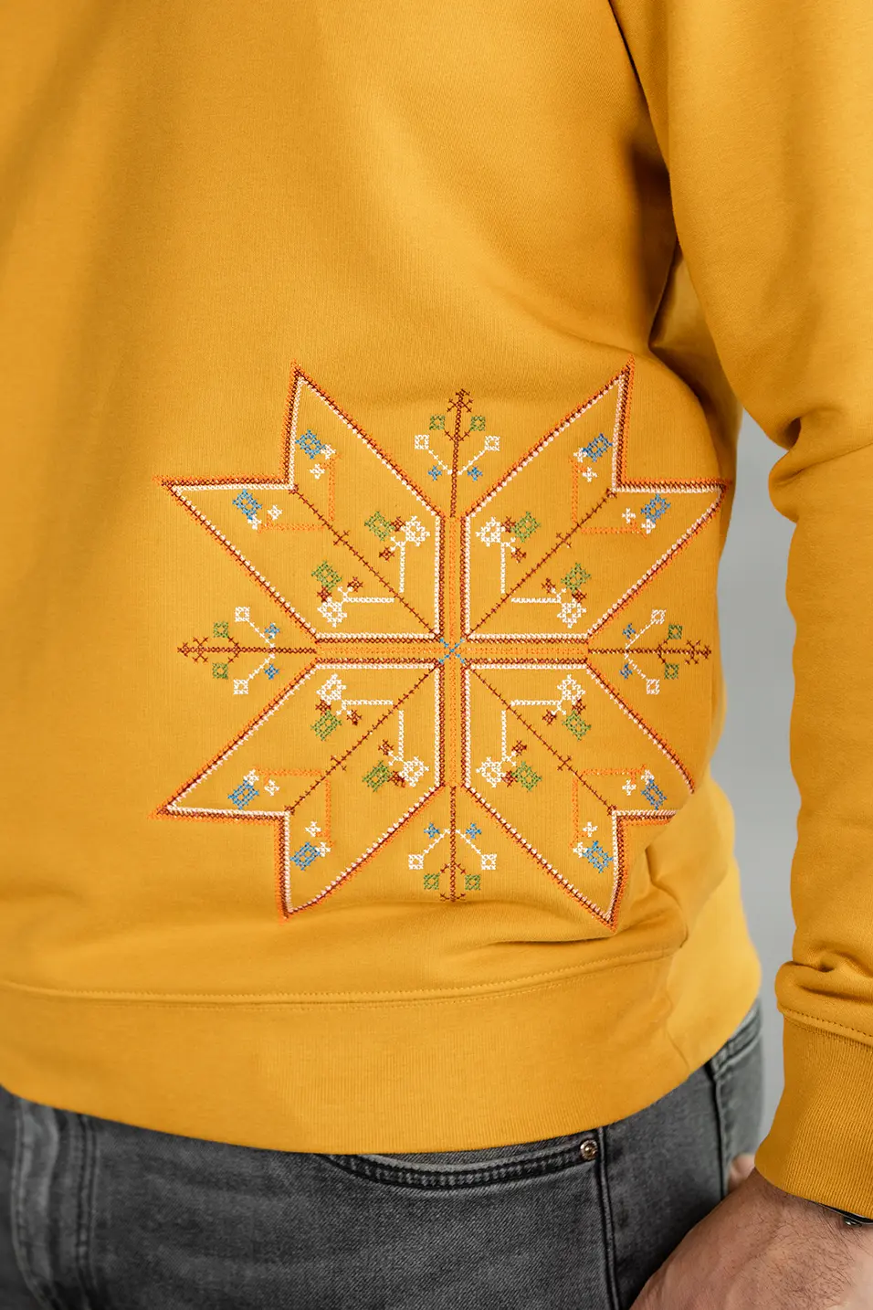 Sinepikollane, pehmest uhutud kangast kaheksakanna tikandiga pusa