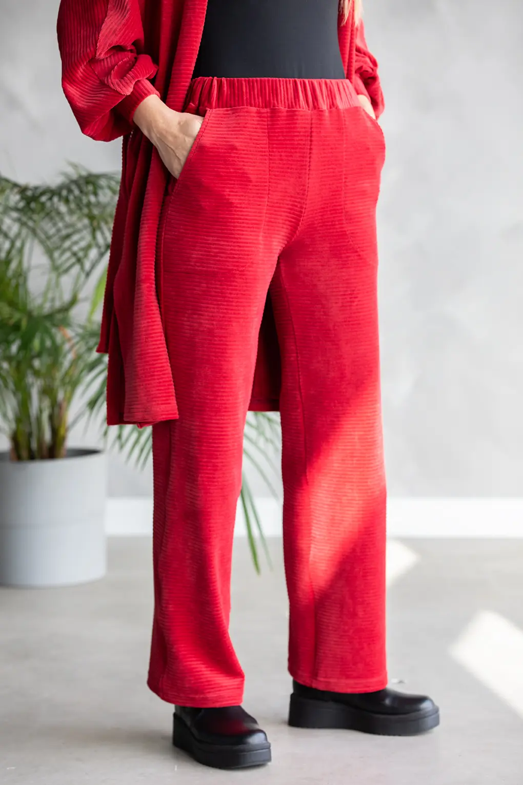Punane kimonolõikeline jakk ja laiad vabaaja püksid.