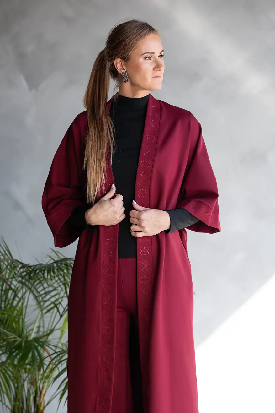 Eksklusiivne bordoopunane Muhu kukkedega naiste kimono jakk.